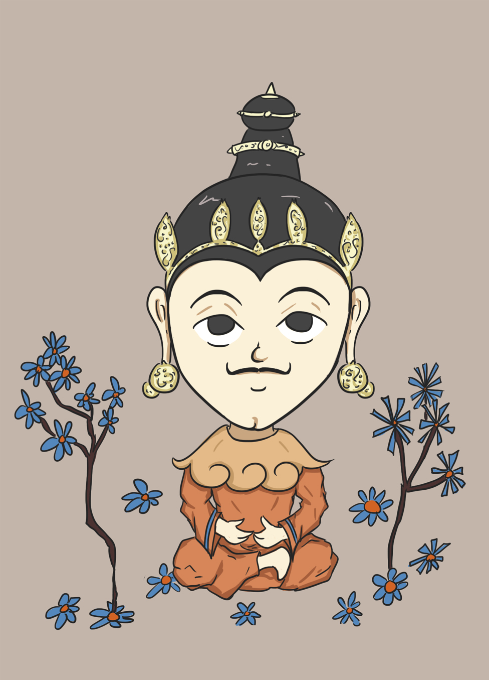 Campaka was a wealthy Tibetan king consumed with the joys of his beautiful gardens. When a begging Yogin was not impressed, the king became curious about what was beyond the pleasures of his life and gardens. The guru instructed him to meditate upon “the flower of reality” to uncover truth. Campaka did this for many years and achieved his goal. Having attained Enlightenment, he taught his courtiers and subjects for the rest of his life.